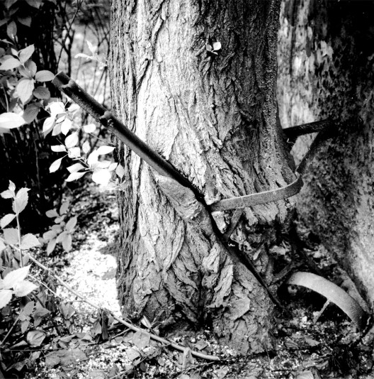 Ihr Holz verrottete, aber der Baum hält das Eisen der Karre jetzt fest umschlossen da, wo der Mensch einst anfassen musste, um zu arbeiten...